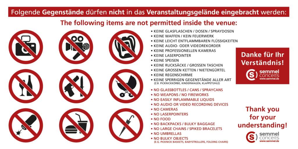 Bei den Konzerten des Sommerfestivals 2024 gelten eigene Sicherheitsbestimmungen. So ist das Mitbringen von bestimmten Gegenständen von Veranstalterseite untersagt. Eine Liste der verbotenen Gegenstände finden Sie in der folgenden Grafik. Bitte lassen Sie betroffene Gegenstände gleich in ihren Fahrzeugen.