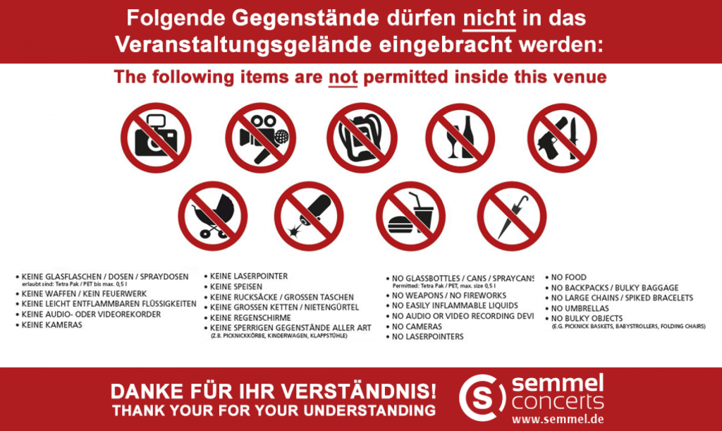 Während Sie keine Rucksäcke mitbringen, können Sie aber z.B. Stofftaschen bis DIN A4 Größe mit in das Gelände nehmen. Feste Regenschirme sind nicht erlaubt, jedoch können Sie faltbare Schirme (Knirps o.ä.) mitbrigen, die Sie allerdings während des Konzerts nicht aufspannen dürfen.